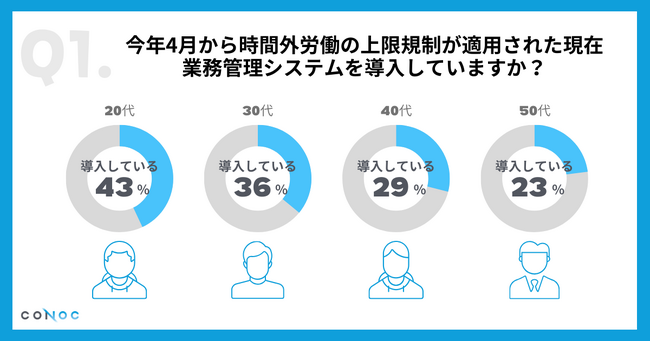 年代別で見ると、20代のみが40%を超えており、40代・50代は30%未満という結果となった。全体で見ても、業務管理システムを導入しているのは半数以下ということが分かった。