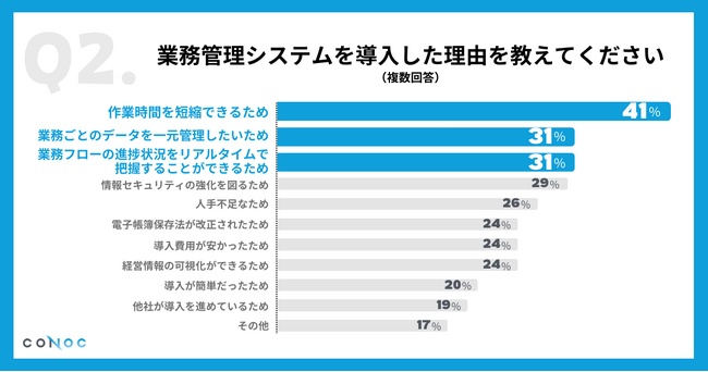 Q1で業務管理システムを導入している人に業務管理システムを導入した理由を聞いたところ、1位は「作業時間を短縮できるため」(41%)、「業務ごとのデータを一元管理したいため」(31%)、「業務フローの進捗状況をリアルタイムで把握することができるため」(31%)となり、業務効率化を目的とした回答が上位となった。