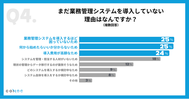 業務管理システムをまだ導入していない人に、業務管理システムを導入していない理由を聞いたところ1位は「システムを導入するほど困っていないから」(25%)、「何から始めたらいいか分からない」(25%)、次いで「導入費用が高額なため」(24%)という結果となった。業務管理システムを導入したい気持ちはあるものの、何をどう進めたらいいか分からない、業務管理システムを担当する人がいないという理由で導入が進んでいないことが分かった。