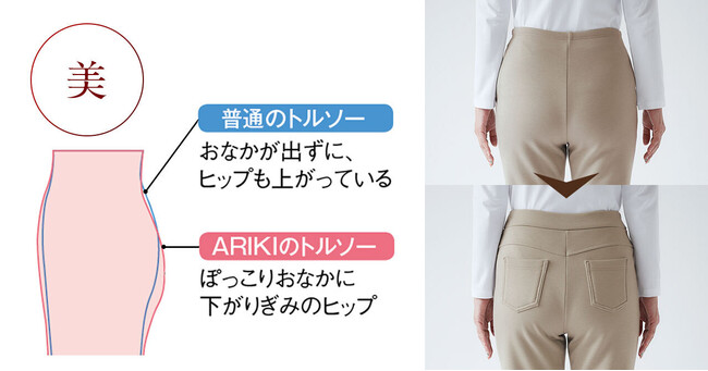 大人の女性の体型を研究し生まれた独自のシルエット、日本製の上質な素材、職人技がひかる立体裁断と縫製。年齢とともに変化する体型をカバーし、女性を美しく魅せる“楽”で“キレイ”なARIKIパンツは、累計販売数1,000万本(※)の実績があります。(※2004年10月1日~2019年10月31日までの累計販売数)