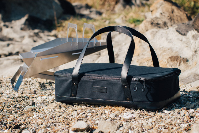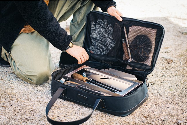 持ち手とブランドタグには牛革を使用し上品に仕上げています。底面は特殊加工により剥離しにくく、防水となっており安心して地面に置くことが可能です。厚みのある仕切りが付属し整理整頓しやすく、仕切りを外せば広く使うことができます。上蓋の裏にも時パーツきのメッシュポケットがついており、火吹き棒やグローブなど細かいものも見やすく収納できます。ジッパーには高品質のYKKジッパーを採用し、開け閉めしやすいようタブをつけるなど、使い勝手を考慮して細部までこだわったアイテムです。