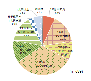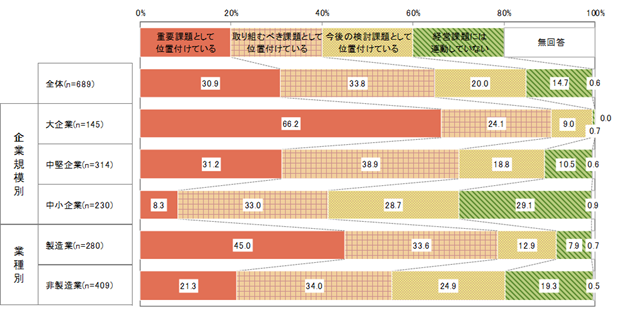 ○ 企業規模別でみると、大企業では、「経営課題には連動していない」が0.7%とごくわずかで、ほとんどの企業がカーボンニュートラルを何らかの形で課題として位置付けていることがわかりますが、中堅、中小と企業規模が小さくなるにつれ、「重要課題」の比率が減少し、「今後の検討課題」「経営課題には連動していない」が増加しています。
