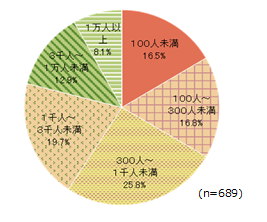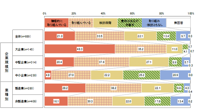 ○ 従業員規模別に見ると、大企業では83.5%、中堅企業でも58.0%が着手しています。中小企業では、取り組みを始めている企業は31.8%に留まるうえ、「取り組み・検討ともなし」が20.9%と、企業規模による差がはっきりと見受けられます。