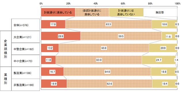 2.8割の企業が進捗について「計画通りに進捗している」「ほぼ計画通りに進捗している」と多数