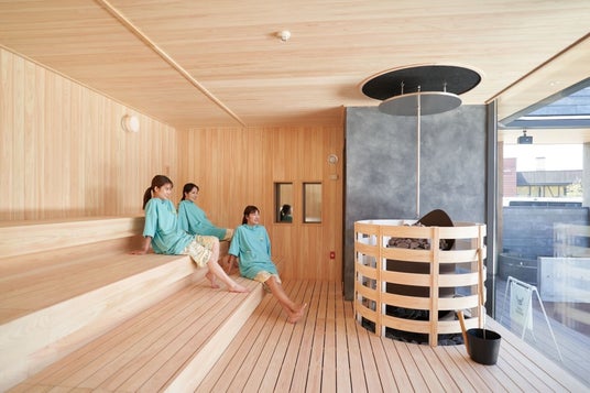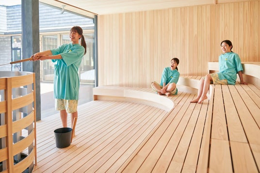 男女、そして大人と子どもが一緒にくつろげるサウナガーデン。水着で入るオートロウリュ付きの大規模サウナ室、ととのいを加速する広々テラスの外気浴ゾーンを備えています。テラス中央には子供たちに大人気の「ふわふわドーム」を配置。
