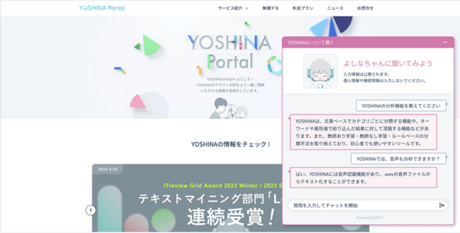 「YOSHINAボット」は、ChatGPTを活用したチャットボットです。コーポレートサイトや製品ランディングページなどに設置することで、企業や製品に関するお問い合わせに自然言語で自動対応することができます。「YOSHINAボット」のためにデータを成形する必要がなく、すでにあるFAQ、マニュアル、HPを反映させればすぐにご利用を始められます。 秋ごろには、企業向けに「YOSHINAボット」のサービス提供を開始する予定です。詳細はこちら( https://note.com/retrieva/n/nd87f67d312d6 )からご覧いただけます。