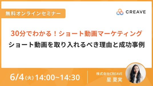 クリエイターとの共創を通じて企業のマーケティング課題を解決する、株式会社CREAVE(本社:東京都千代田区、代表取締役社長:中村真奈、以下 CREAVE)は、6月4日(火)にマーケティング担当者様・広告代理店様向け無料オンラインセミナーを開催します。