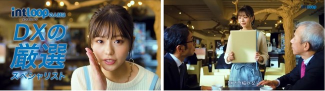 とあるカフェで向かい合って会話する二人のビジネスマン。二人は自社が進めるDXにおける課題に悩んでいます。その様子に気づいた女性店員が席を訪れ、二人にメニューを手渡します。メニューには、INTLOOPが擁するスペシャリストの種類が紹介されており、ビジネスマンたちは課題解決の糸口を見つけます。