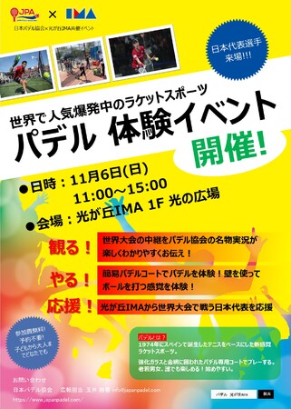 日本パデル協会(会長:中塚アントニオ浩二、以下JPA)は、2022年度パデル日本代表のシルバーパートナーである 株式会社新都市ライフホールディングス(代表取締役社長 新居田 滝人)とコラボレーションのもと、11月6日(日)光が丘IMA 光の広場にてパデル体験会&パブリックビューイングイベントを開催いたします。