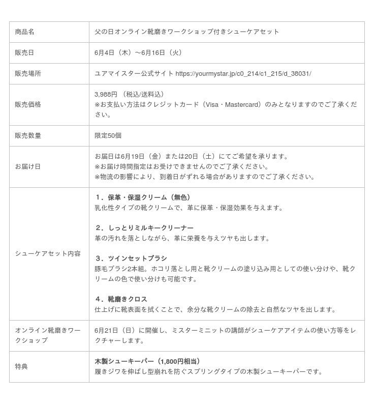靴修理などのリペアサービスの全国チェーン「ミスターミニット」※(以下「ミスターミニット」)を展開するミニット・アジア・パシフィック株式会社(本社:東京都台東区、代表取締役社長:迫俊亮)と、日本最大級のハウスクリーニング・リペア産業のIT化プラットフォームを運営するユアマイスター株式会社(本社:東京都世田谷区、代表取締役:星野貴之)は、父の日に大切なお父さんへ贈るプレゼントとして、「父の日オンライン靴磨きワークショップ付きシューケアセット」を限定50セットで6月4日(木)から販売開始します。ご購入いただいた方には、さらに特典として、靴を長く愛用するための必須アイテムであるシューキーパーをプレゼントします。
