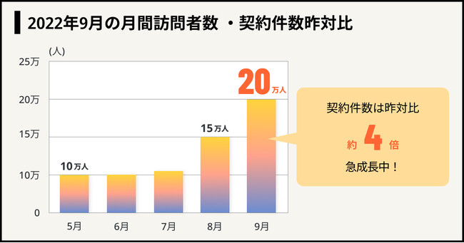 2022年9月には月間訪問者数が20万人を突破し、同月の契約件数は昨対比で約4倍と急成長しています。成長の背景として、コロナ禍による医療保険のニーズ増加に加え、様々な機能開発及びマーケティングの実施、また、日本においても保険をオンラインで比較・契約する文化が定着しつつあることが挙げられます。