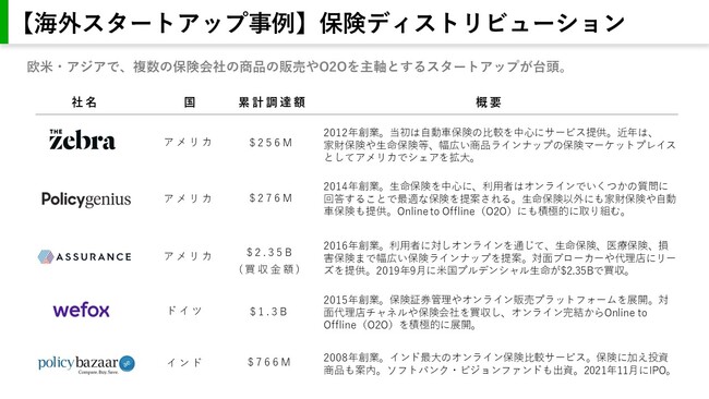 当初は、商品組成(オンデマンド保険やP2P保険等)を行うメーカーが中心にInsurtechは発展していきましたが、2021年にソフトバンク・ビジョンファンドも出資するPolicyBazaarがIPOを実施するなど、ディストリビューションに特徴を持ち、ユーザーと顧客接点の確率、分かりやすい商品比較や契約管理などに強みを持つ企業が台頭してきました。