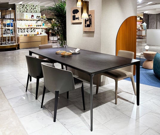 優美な脚部のデザインが人気のダイニングテーブル IENA。テーブルに合わせて、あえて異なるデザインのチェア FLUTEとチェア VERAをコーディネート。