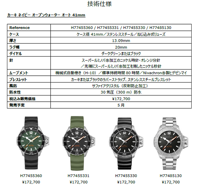 46mmモデルと同様に、41mmの「カーキ ネイビー オープンウォーター オート」も、80時間の標準持続時間を実現し、衝撃、急激な温度変化、磁場に強いNivachron(R)製ヒゲゼンマイを備えたH-10自動巻ムーブメントを搭載しています。