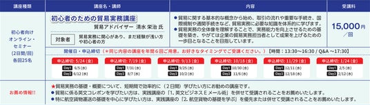 ● 初心者向けオンラインセミナー・初心者のための貿易実務講座(2日間/回:各回25名)