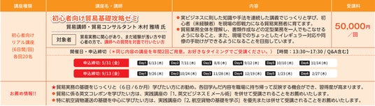 ● 初心者向けリアル講座・初心者向け貿易基礎攻略ゼミ(6日間/回:各回20名)