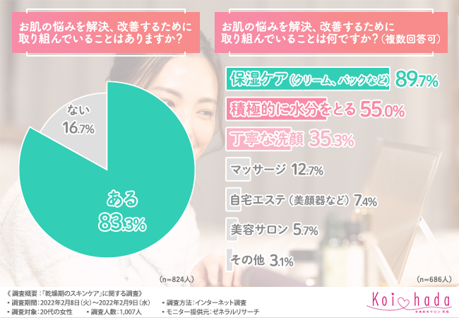 そこで、「お肌の悩みを解決、改善するために取り組んでいることはありますか?」と質問したところ、『ある(83.3%)』『ない(16.7%)』との結果となりました。