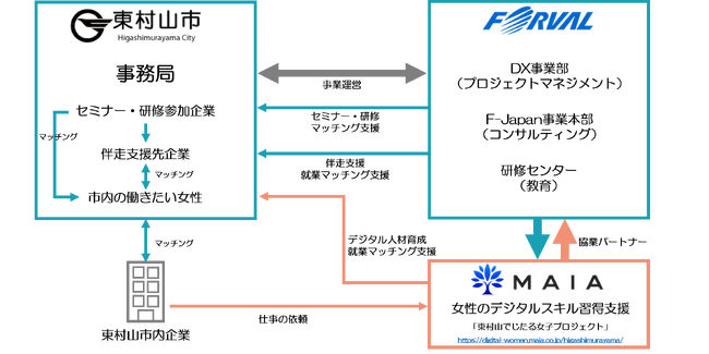 女性が自分らしく働く環境を作るため、女性テレワーカーの育成と全国の企業・自治体のデジタル化支援を行う株式会社MAIA(本社:東京都港区、代表取締役:月田 有香、以下「MAIA」)は、株式会社フォーバル(本社:東京都渋谷区、代表取締役社長:中島 將典、以下「フォーバル」)が受託した、東京都東村山市の中小企業等デジタル化推進支援事業及び女性デジタル人材育成事業にて、フォーバルと業務提携を行い、女性デジタル人材育成事業を担当いたします。