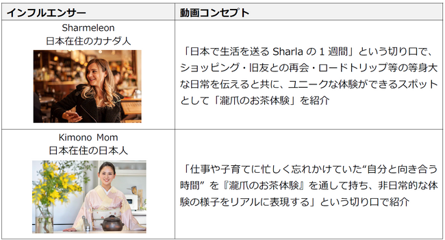 今回Tokyo Creativeでは、訪日外国人に向けて2021年にオープンした「瀧爪のお茶体験」の認知拡大と誘客を図ることを目的とし、幅広いターゲット属性にリーチすべく、ジャンルの異なる2名のインフルエンサーを起用しました。また、体験をリアルに楽しむ動画であることを重要視し、それぞれのインフルエンサーが得意とする撮影方法の採用と、それぞれのファンに響く異なる切り口の動画を2本企画・制作しました。