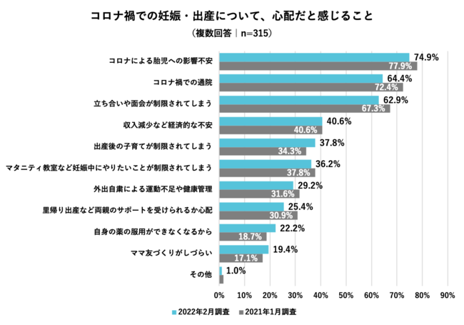 コロナ禍での妊娠・出産で心配だと感じていることを質問したところ、TOP3は、1位「コロナによる胎児への影響」(74.9%)2位「コロナ禍での通院」(64.4%)3位「立ち会いや面会が制限されてしまう」(62.9%)であることがわかりました。