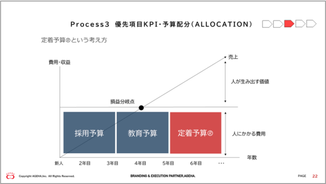 中でも、「Process3 理想と現実のギャップを埋めるために、 KPIの設定と予算配分を行う」の中では、『定着予算(R)』という考え方を提唱しています。