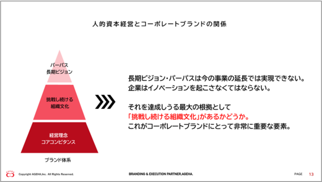 イノベーションや変革を起こす、それを実現する社員の背中を押す「組織文化」をもつことは、コーポレートブランドとしてその企業らしさを表現するものにもなります。イノベーションを起こす根拠として、「挑戦し続ける組織文化」があるかどうかが、今後のコーポレートブランドにおいて、パーパスの次に注目されるものだと考えます。