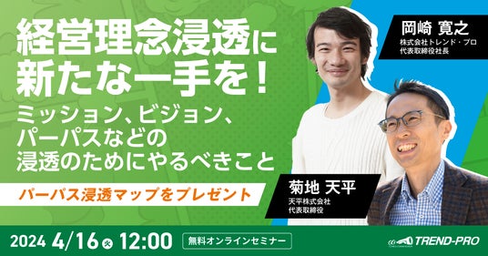 株式会社トレンド・プロ(本社:東京都港区、代表取締役社長:岡崎寛之、以下トレンド・プロ)は、天平株式会社(本社:神奈川県横浜市、代表取締役:菊地天平、以下TENPEI)と共同で、経営理念やミッション/ビジョン/バリュー、パーパス浸透のためにやるべきことを解説するオンラインセミナーを4/16(火)12時から開催いたします。