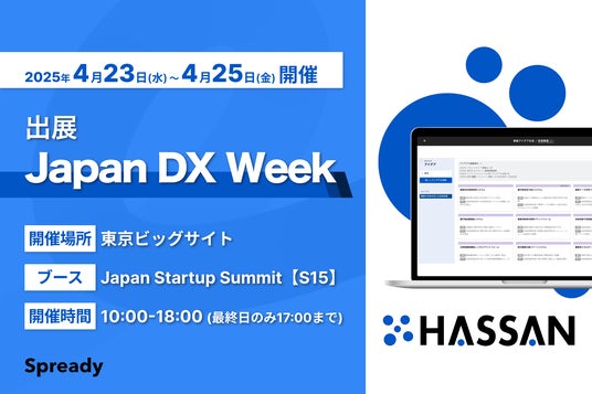 Spready株式会社(本社:東京都渋谷区、代表取締役社長:佐古雅亮)は、2025年4月23日(水)~4月25日(金)に東京ビッグサイトで開催される「Japan DX Week 春」に出展いたします。本展示会内の「Japan Startup Summit」にて、新規事業に関わる社内新規事業担当者様向けに、アイデア発散を自動化する新規事業特化型AIサービス「HASSAN」をご紹介します。当日お越しいただいた方には実際にデモを行いながらAIを活用したアイディエーションについてお話できればと考えております。