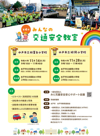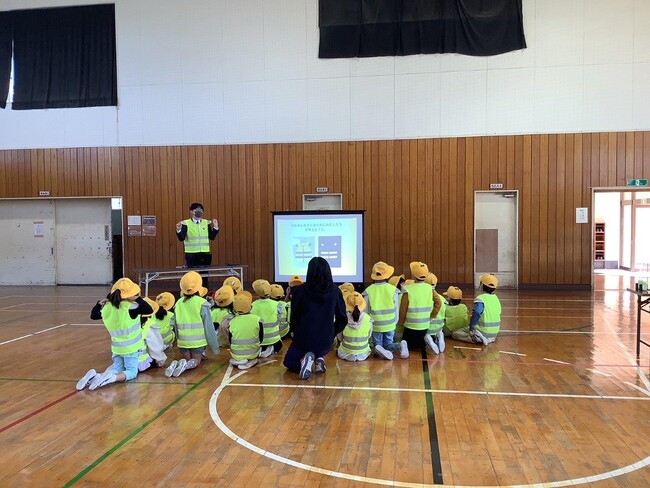当日は1.腹話術の交通安全指導、2.トラックの内輪差と死角、3.自動車の衝突時の衝撃体験、4.児童向け高視認性安全服「みとちゃんピカベスト」の効果の4つのプログラムを児童が体験しました。
