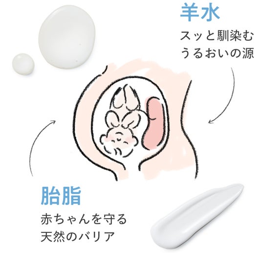 羊水×胎脂の成分を参考に作製しています。おなかの中で赤ちゃんを守っている羊水と胎脂の成分であるアミノ酸11種類とセラミドを配合。1mmしかない未成熟な赤ちゃんの肌を守ります。