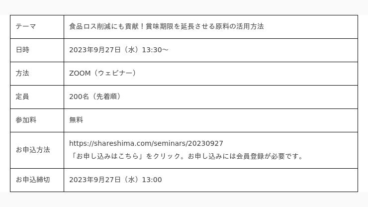 2023年9月27日(水)に開催する第34回セミナーは、「賞味期限を延長させる原料の活用方法」がテーマです。食品の安全性を確保するために重要な「賞味期限」。近年、食品ロス削減が推進される中、食品のロングライフ化が求められています。当セミナーでは、賞味期限を延長させる食品原料とその活用方法について登壇企業様にご紹介いただきます。