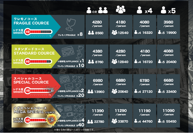 コースは「ワレモノコース」、「スタンダードコース」、「スペシャルコース」、「メガスペシャルコース」の4つのコースから選択でき、各コースは壊せる物の種類と量、体験時間が異なります。