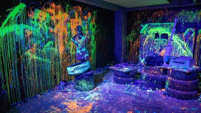 "NEON SMASH"では、暗闇の部屋の中で、ネオンカラーに光り輝く食器や小型家電を、バット等の武器を使用して思う存分壊すことができます。