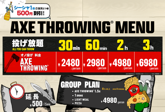 BREAK ROOM(物壊し)とAXE THROWING(R)︎(斧投げ)とのセット利用はもちろんですが、シーシャのみでの利用も可能です。
