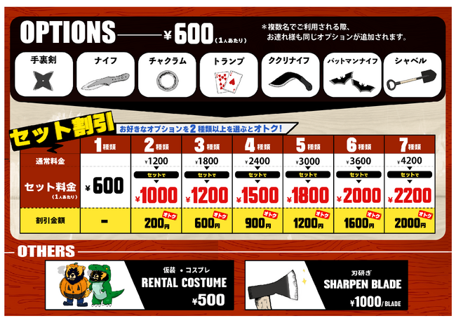 斧以外にも、手裏剣、スローイングナイフ(ナイフ投げ)、トランプ、チャクラム、ククリナイフ、バットマンナイフ、シャベルをオプションとして追加することが可能です。