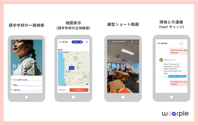 『warple』では、語学学校スタッフとの1on1チャットや、留学経験者が撮影したリアルな留学動画など、お役立ちコンテンツも満載。SNS慣れしている10代20代のZ世代の方が気軽にご利用いただけるよう、今後はさらに機能を充実させる予定となっています。