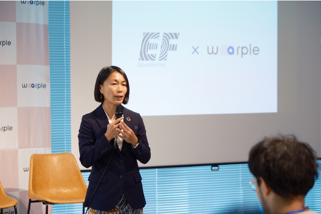 事業説明の後には、『warple』との提携校を代表して語学学校『EF Education First(イーエフ エデュケーション ファースト、以下EF)』のMarketing Directorである伊丹 麻衣子 様が登壇され、留学経験やwarple提携の経緯についてご説明いただきました。『EF』は、スウェーデンを発祥に、世界50都市に展開をしている語学学校で、世界100都市から生徒が集まる人気校として認知されています。