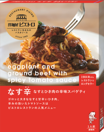 ◇1984年にピエトロレストランに登場し、ロングセラーとして不動の人気No.1メニュー「なす辛」を、ご家庭でも手軽にお楽しみいただけるレトルトパスタソースです。