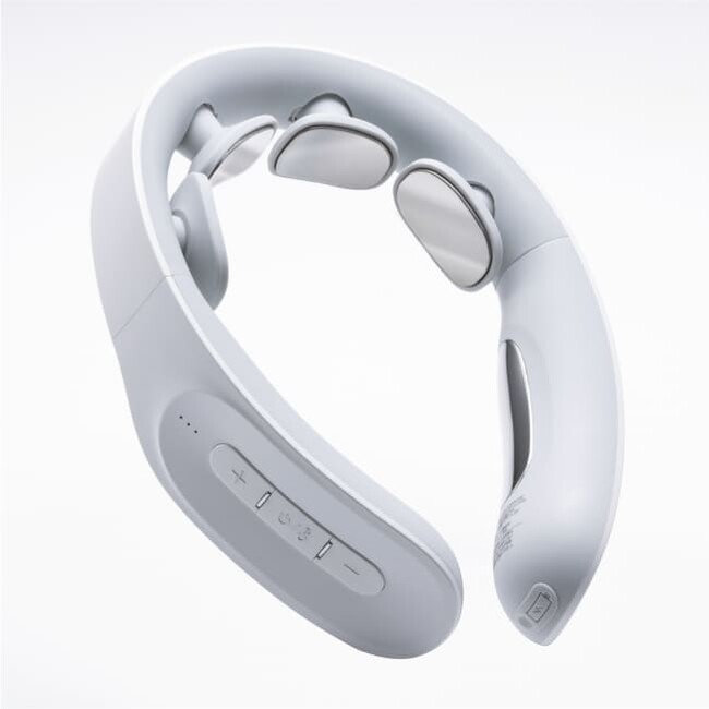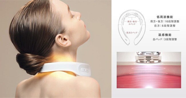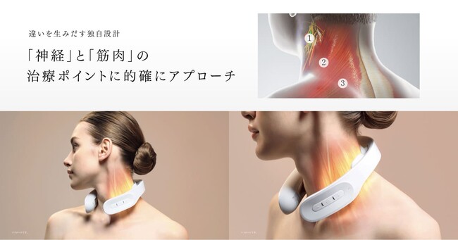 今回発売する「DR. ヒートネック」は、MYTREXより発売している従来の低周波治療器「EMSヒートネック」から、さらにグレードアップ。首や肩の「神経と筋肉」の構造に合わせて、首を囲むように6枚のパッドを配置し、首後方のみのケアに比べ、より効果的に**慢性的なコリや痛みを伴う部位をマッサージできるようになりました。