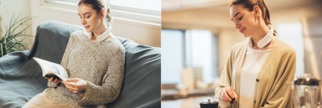 首から肩にフィットするようなラウンドデザインで抜群のフィット感を実現。本体の重量は、わずか約160gと軽く、隙間ができにくい設計を採用することで、『動いてもズレない』という着け心地の快適さを追求しました。
