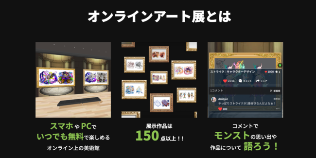 「モンスターストライク オンラインアート展」は2021年10月1日 ~ 2021年11月7日に「モンスト」の8周年を記念し開催され、キャラデザイン資料や新作描き下ろしイラストなどが展示されました。