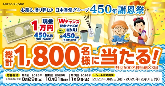 株式会社日本香堂(本社:東京都中央区、代表取締役社長:土屋 義幸)は日本香堂グループ450年を迎え、日頃よりご愛顧いただいているお客様への感謝の意を込めて、「心躍る、香り弾む♪日本香堂グループ450年謝恩祭」キャンペーンを、2025年6月9日(月)より実施いたします。