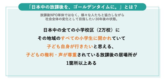 設立当初からの目標でもあった全国各地の放課後の居場所の質向上にも近年挑戦しはじめ、これまでのビジョン「放課後はゴールデンタイム」に、”日本中の放課後を”という決意を表しながら、組織一丸となって取り組んでいくミッションとして新たに策定しました。
