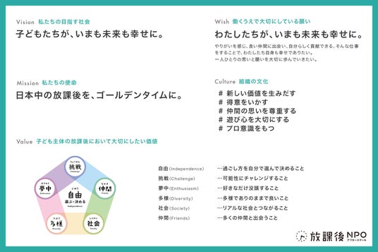 ミッション、ビジョンに加え、子ども主体の放課後において大切にしたい価値(Value)や、組織の文化(Culture)も言語化。さらに、私たち職員が働くうえで大切にしている願い(Wish)も、ビジョン・ミッションに向き合うために不可欠なものとして理念体系の中に組み込まれました。