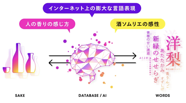 日本酒ソムリエAI「KAORIUM for Sake」は、インターネット上の膨大な言語表現と人の香りの感じ方を学習した AI に、1 万以上の日本酒の風味・感性データと酒ソムリエの感性を融合させた最先端の AI システムです。自然言語処理によって、表現の難しい 日本酒の風味を、わかりやすい言葉で表したり、ある言葉に紐づく日本酒を導き出することを可能にします。