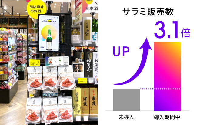 また、店内にある日本酒とフードのペアリングを提案するペアリングサイネージも設置したところ、総効果は売上 39%UP。サラミは販売数3.1倍を記録。さらに、サラミのペアリング商品としてレコメンドされた日本酒「福光屋加賀鳶 極寒純米」は、販売数が22倍まで上がりました。