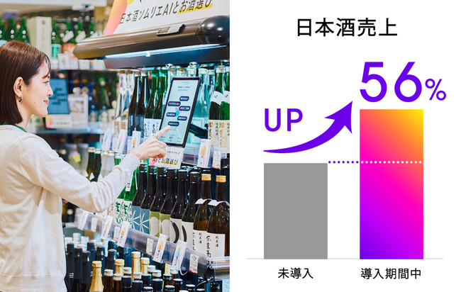 紀ノ国屋とセントマティックはこれまで、日本酒ソムリエ AI「KAORIUM for Sake」を使った、売り場での実証実験を行ってきました。2021年11月9日~12月8日に実施した、紀ノ国屋 渋谷スクランブルスクエア店での実証実験では、日本酒ソムリエAI「KAORIUM for Sake」のお酒選びタブレットを日本酒売り場に設置したところ、1 日あたり50人以上接客することができ、導入前月と比較して日本酒の販売数55%UP、売上56%UPを記録しました。