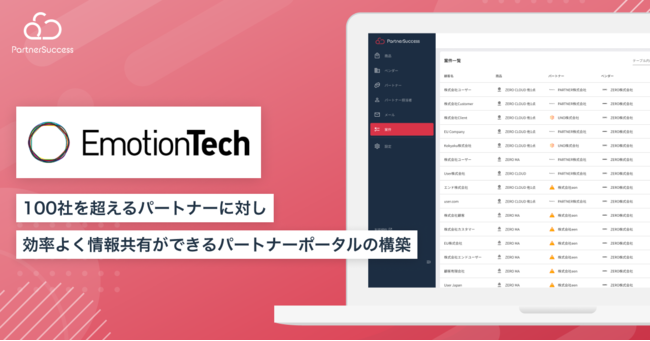 代理店販売で業績を伸ばすPRM(※1)-代理店連携管理クラウド「PartnerSuccess」を開発運営するパートナーサクセス株式会社(本社:東京都渋谷区、代表取締役 永田雅裕、以下「パートナーサクセス」)は株式会社エモーションテック(本社:東京都港区、代表取締役社長 今西良光、以下エモーションテック)にPartnerSuccessを導入頂きました。