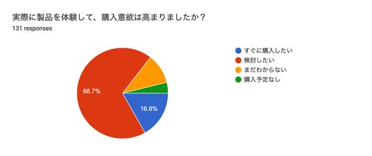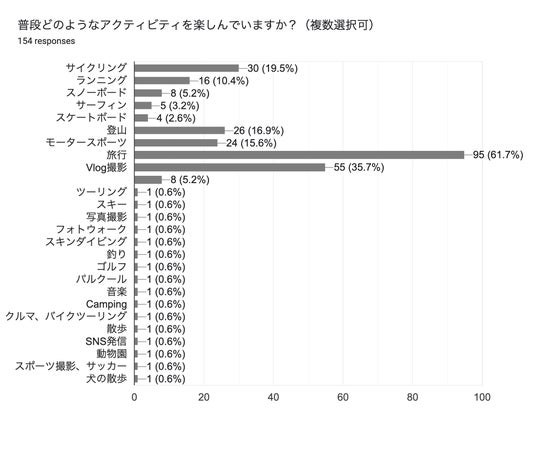 トークセッションにご参加いただいた154名を対象にアンケートを実施したところ、「実際に製品を体験して購入意欲が高まった」と答えた人が全体の68%を占め、実際に触っていただいた事でより製品に興味を持っていただけました。また、トークセッションに対しての評価、スタッフに対する評価も共に高評価をいただきました。「普段どのようなアクティビティーを楽しんでいるか」という質問に対して、「旅行」、「Vlog」と答えた方が多く、今後は旅行やVlog、日常の撮影に選ばれるカメラとして機能等を紹介していきたいと考えております。