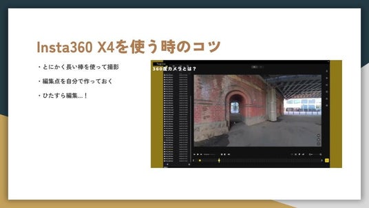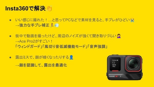 「Insta360と楽しむ動画の世界。日常を、もっと楽しい思い出に」をテーマに、Insta360との出会い、推しのInsta360カメラ、作例と使用方法、設定方法を主にご紹介いただきました。映像制作を始めるのにおすすめなInsta360機材など、これから映像クリエイターを目指す方にもInsta360製品は活用できると語っていただきました。